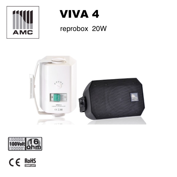 Reprobox VIVA 4 vyniká elegantním, moderním designem, hladkým povrchem skříňky a jemnou mřížkou. Klasický tvar s pokročilým zaoblením, který umožňuje, aby se reproduktor snadno přizpůsobil v celé řadě současných interiérů a stal se nedílnou součástí architektury. Otočné logo AMC a půlkruhový U-držák umožňuje širokou škálu možností montáže. Nastavení výkonu je velmi jednoduché. Mimořádně tenký a plochý přepínač výkonu vypadá velmi elegantně. Integrovaný konektor typu Phoenix podtrhuje moderní design reproduktoru. Je možné vybírat ze dvou bare. Reprobox je osazen 4" wooferem a 1" tweeterem.