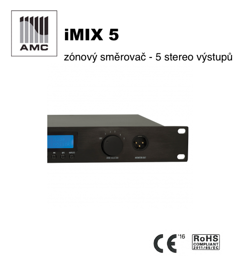 Stereofonní zónový směrovač iMIX 5 je vybaven 5-ti stereofoními výstupu pro multizónové řízení audia. iMIX 5 disponuje 4-mi vstupy zdrojů audio, ktzeré mohou být směrovány na kterýkoliv z 5-ti výstupů, které jsou k dispozici. Zdroje pro individuální zóny mohou být navoleny zónovým voličem na předním panelu přístroje nebo požitím nástěnného ovladače nebo pomoicí příkazů protokolu RS 232. iMIX5 je vybaven vnitřním přehrávačem médií s USB, bluetooth, FM přijímačem a vstupem AUX. Je k dipozici i kontakt priority a konektor externího umlčení pro účely evakaučního ozvučení. K přístroji lze také připojit stanici hlasatele pro volbu hlášení do jednotlivých zón. K dispozici obslužný software.